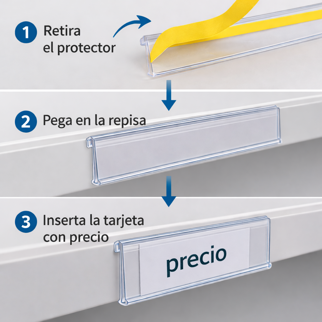 El Fleje Plano con Adhesivo es una huincha plástica fabricada en HDPE (polietileno de alta densidad) con adhesivo incorporado, diseñada para fijarse fácilmente en bandejas de góndolas, repisas y otros muebles exhibidores. Permite destacar precios y etiquetas de forma ordenada y profesional en el punto de venta.