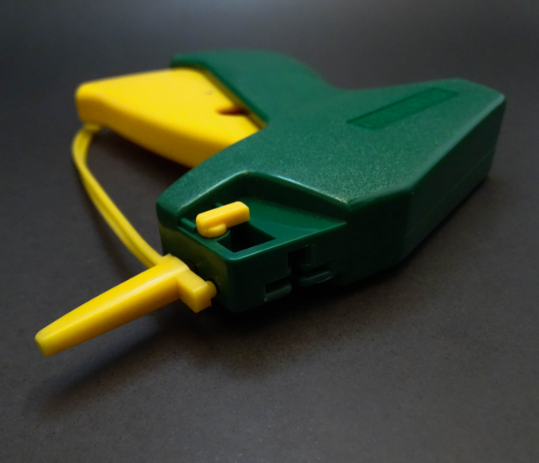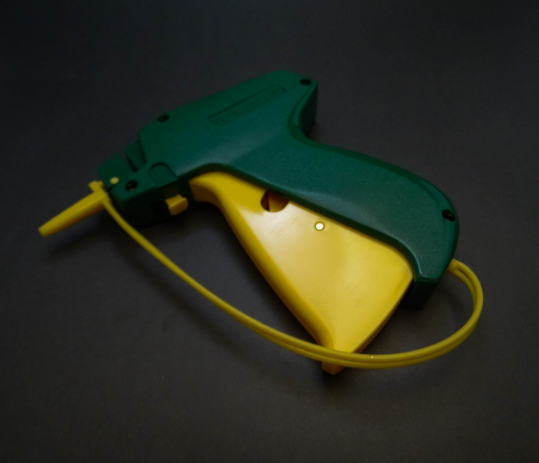 Pistola manual para etiquetado de prendas de vestir, disponible en versión fina o estándar.