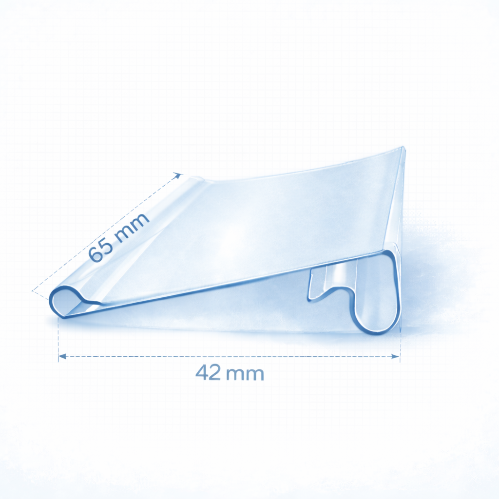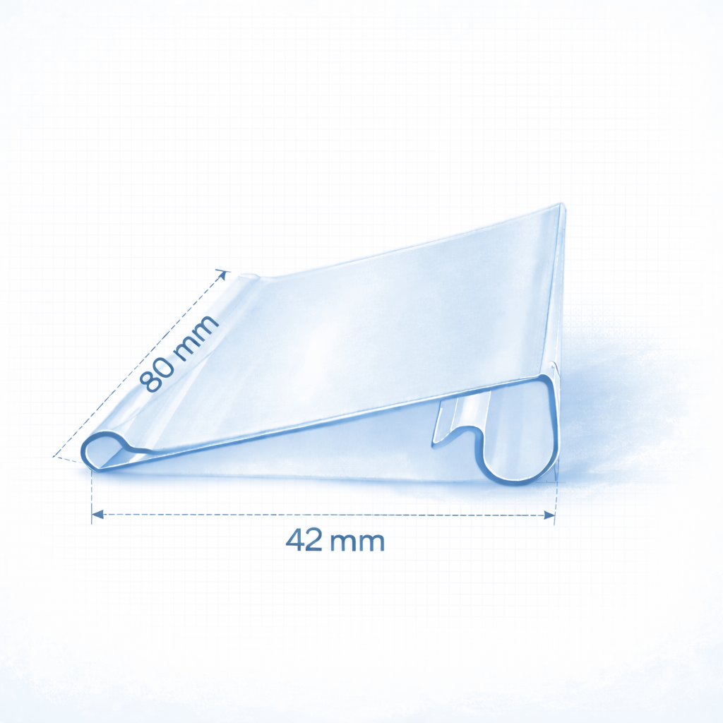 El Porta Precio VHT está fabricado en HDPE (polietileno de alta densidad), lo que le otorga durabilidad y resistencia al uso cotidiano en puntos de venta. Es usado generalmente en ganchos metálicos doble para exponer precios, también en rejillas o bandejas de refrigeración, facilitando la identificación de productos y precios para los consumidores.
