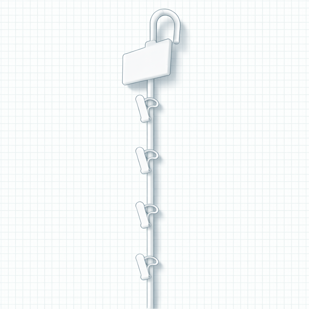 Tira metálica de 12 posiciones para soportar mayores pesos y diversos envases con y sin agujero de colgado, gracias a su apriete tipo mordaza. Incluye cabezal para destacar precio o logo promocional. Ideal para puntos de venta con alta rotación de productos pesados.